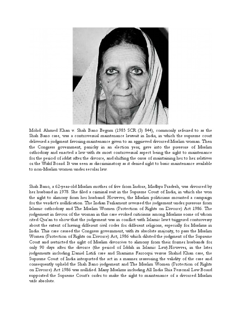 Shah bano begum (shah bano). At that time, the supreme court ( supreme court ) of a divorced muslim woman spoke of india, shah bano, upkeep. Shah bano begum and ors. It is seen as one of the milestones in muslim women's fight for rights in. The case of shah bano dates from the year 1985. Shah bano begum was married to a lawyer named mr. Ahmed khan vs shah bano begum and ors on 23 april, 1985. In april 1985, the supreme court delivered a judgement on the maintenance a divorced muslim woman would be entitled to receive from her former husband in the case of mohammed ahmed khan v. In which of the following cases the supreme court has held that right to fair trail is a part of article 21 a mohammed ahmed khan vs. Shah bano was the time of divorce already advanced age and had no source of income, since there is no social security system in india. Begum out of the shared household and ms. Shah bano case or commonly referred to as the shah bano maintenance case is often considered as the pioneer case which laid the foundation of the muslim women's fight for equal rights in matters of marriage and divorce in india. Advocate mohammed ahmad khan and shah bano were married in 1932 and had three sons and two daughters in the marriage.